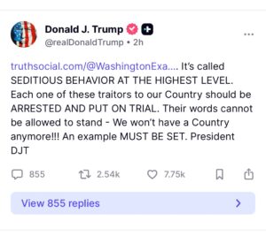 ”Yhdysvaltain kongressin istuvat jäsenet, juonittelivat yhdessä järjestääkseen videoviestin Yhdysvaltain armeijan jäsenille… rohkaistakseen heitä uhmaamaan presidentin laillisia määräyksiä.