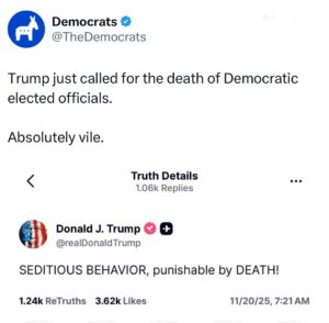 Yhdysvaltojen presidentti Donald Trump julkaisi 20.11.2025 Truth Social palvelussa viestin, joka kuulostaa autoritaariselta uhkaukselta. Viesti kirvoitti demokraateilta yhtälailla rajun vastauksen.